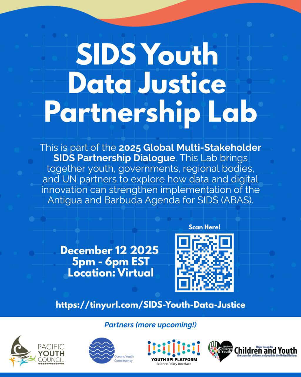 The SIDS youth from the Caribbean, Pacific, and AIMS regions, this opportunity wants to hear from you. On 12 December 2025, from 5 to 6 p.m. AST (virtual), they are bringing young people together to talk about the real issues affecting their islands, including climate, safety in their communities, and opportunities in the ocean economy. The SIDS Youth Data Partnership Lab is a space to share your experiences, learn from others, and build ideas that can improve life in your islands. No special knowledge is needed. Your voice is enough.