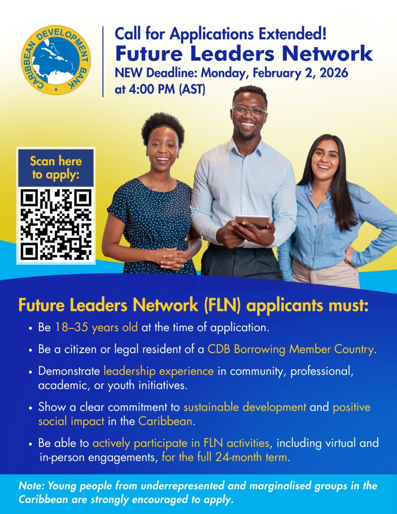 Applications are now open for the Caribbean Development Bank Future Leaders Network 2026. The Caribbean Development Bank (CDB) invites young leaders across its Borrowing Member Countries to apply for the Future Leaders Network (FLN), a flagship mechanism that strengthens youth participation in the Bank’s development agenda. The FLN offers a unique opportunity for diverse young men and women to contribute to CDB’s programmes, policies, and strategic priorities, reinforcing the Bank’s commitment to a more resilient, inclusive, and sustainable Caribbean.