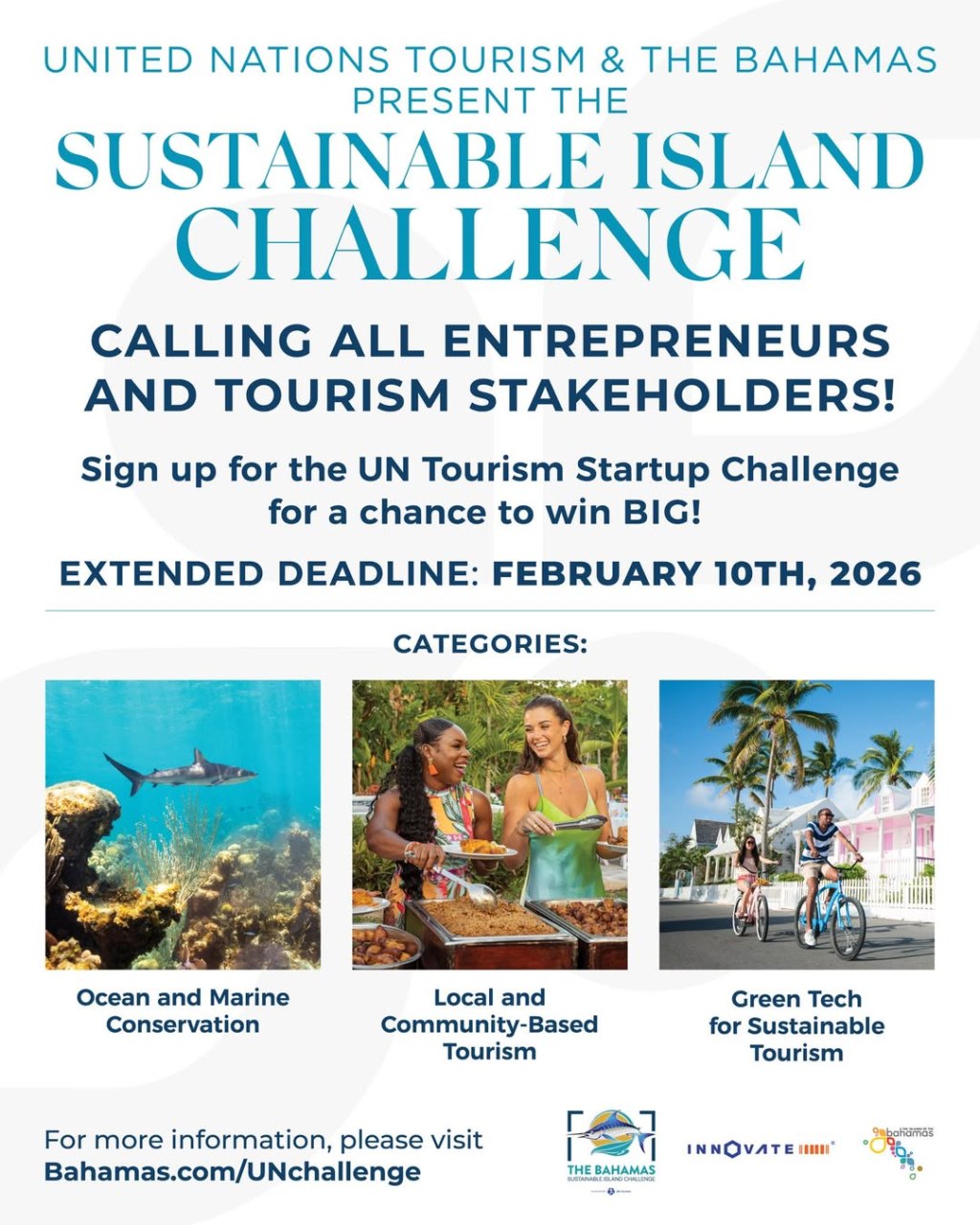 Applications are now open for the UN Tourism Bahamas Sustainable Island Challenge 2026. UN Tourism and The Bahamas Ministry of Tourism, Investments & Aviation are joining forces in this startup challenge to source the most sustainable, innovative and disruptive business models to provide answers and smart solutions to the complex challenges the Bahamas is facing as a Small Island Developing Island State (SID). The UN Tourism Bahamas Sustainable Island Challenge is calling on startups, entrepreneurs, and innovators to deliver bold, transformative solutions that support national and global sustainability goals.